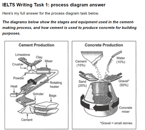 The diagram below shows the stages and equipment used in the cement -making process and how cement is used to produce concrete for building purposes